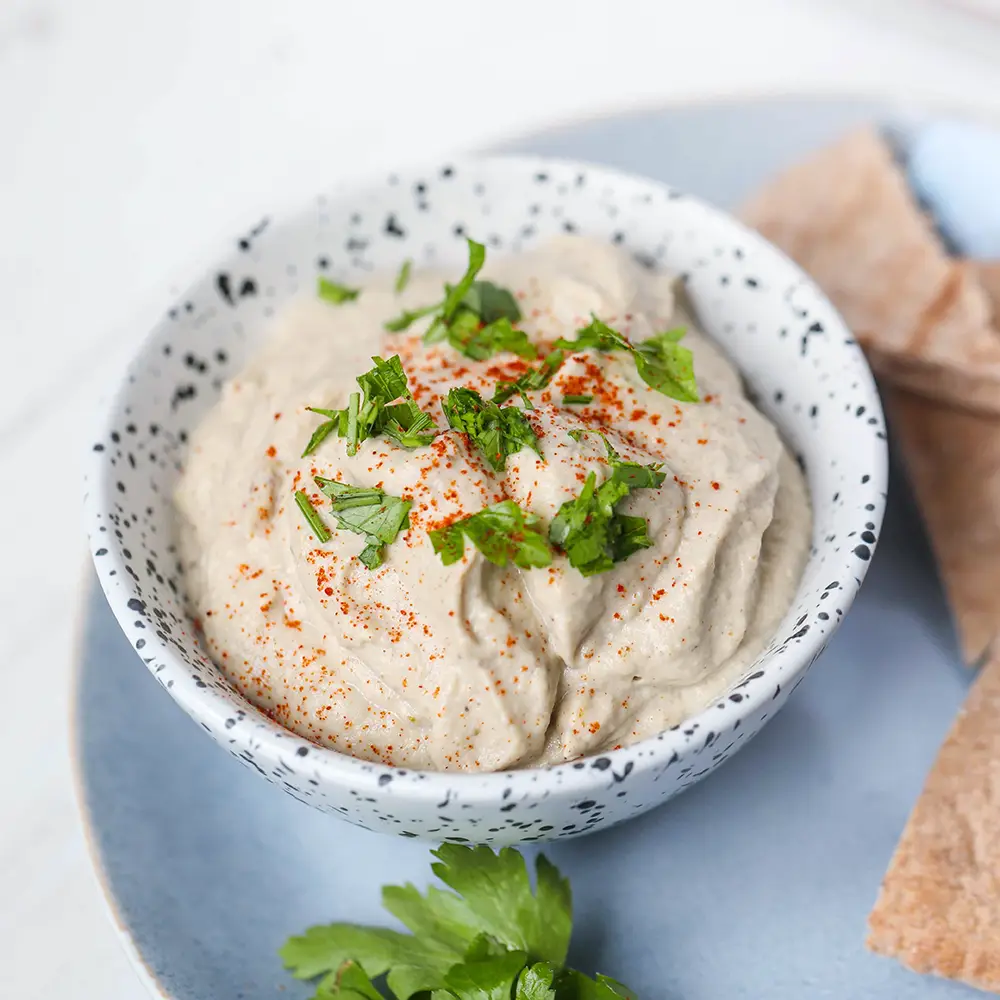 Place the flesh in a bowl, add the garlic, lemon juice, tahini, olive oil, and cumin. Mash everything with a fork, and continue stirring and mashing until the mixture is creamy—season to taste with salt.