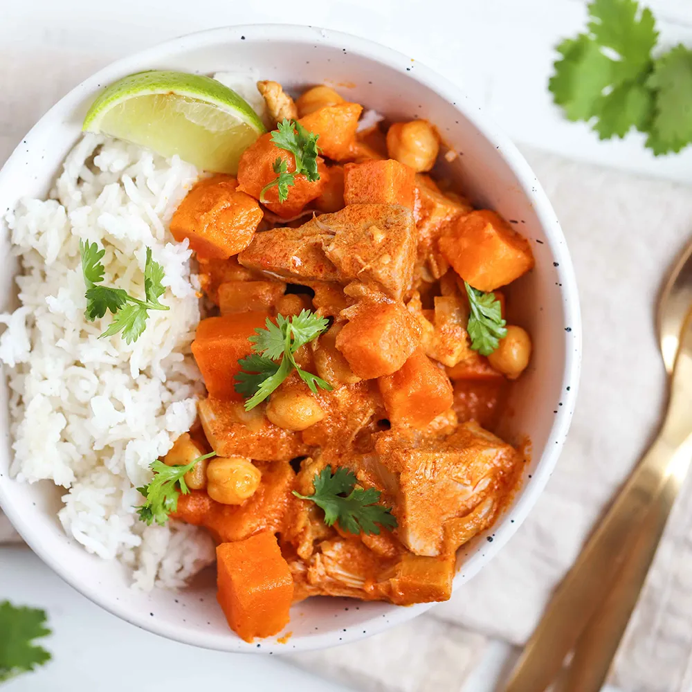 Spoon the curry over the rice and garnish with cilantro and a squeeze of fresh lime.
